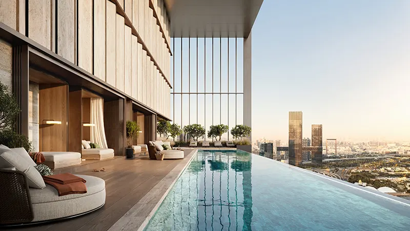 Planned for grand communal living, Tower A combines 59 floors with 394 exclusive residences and Tower B has 56 levels and 360 opulent abodes. All the apartments offer speak of upscale elegance and sophistication with a master-bedroom that covers a walk-in closet, a generously sized balcony, double-height ceilings and windows of the same height, unveiling excellent views of the city from the modern living room integrated with kitchen & dining space. Perched on the top of this pinnacle gem, the four-bedroom homes capture the elevated living for special elites who seek something extraordinary. Here, each unit offers an expansive indoor space with seamless access to the personal terrace with impressive views of the skyline, a social lounge, BBQ counter, dining area, plunge pool, & a landscaped garden.